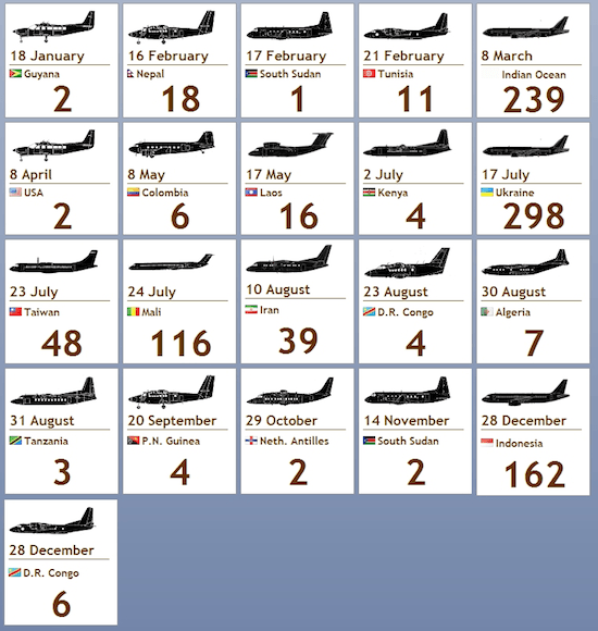 The great majority of fatal accidents involved small planes flying internal routes in developing countries. The two major commercial airline accidents with more than 100 casualties that happened in 2014 were not caused by technical failures: in the skies over Ukraine a plane was shot down by a rocket and the Indonesian crash was due to a human mistake of the pilot.
