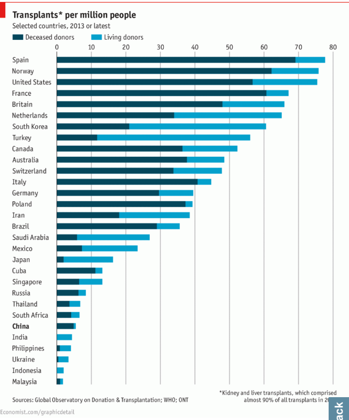 In China, where each year around 300,000 people are put on a transplant waiting-list, one way of relieving this pressure has been to “harvest” organs from executed prisoners. Once the main source of transplanted organs, the share from prisoners is reported by the government to have halved in recent years (mirroring what is believed to be a large decline in executions). From January 1st, the government is expected to put an end to such organ harvesting altogether, and all transplanted organs will need to come from volunteered sources. The new system would still be vunerable to abuse: prisoners could be pressured into donation, for example. But if forced harvesting stops, the public’s willingness to donate must increase from relatively low levels to make up the difference.